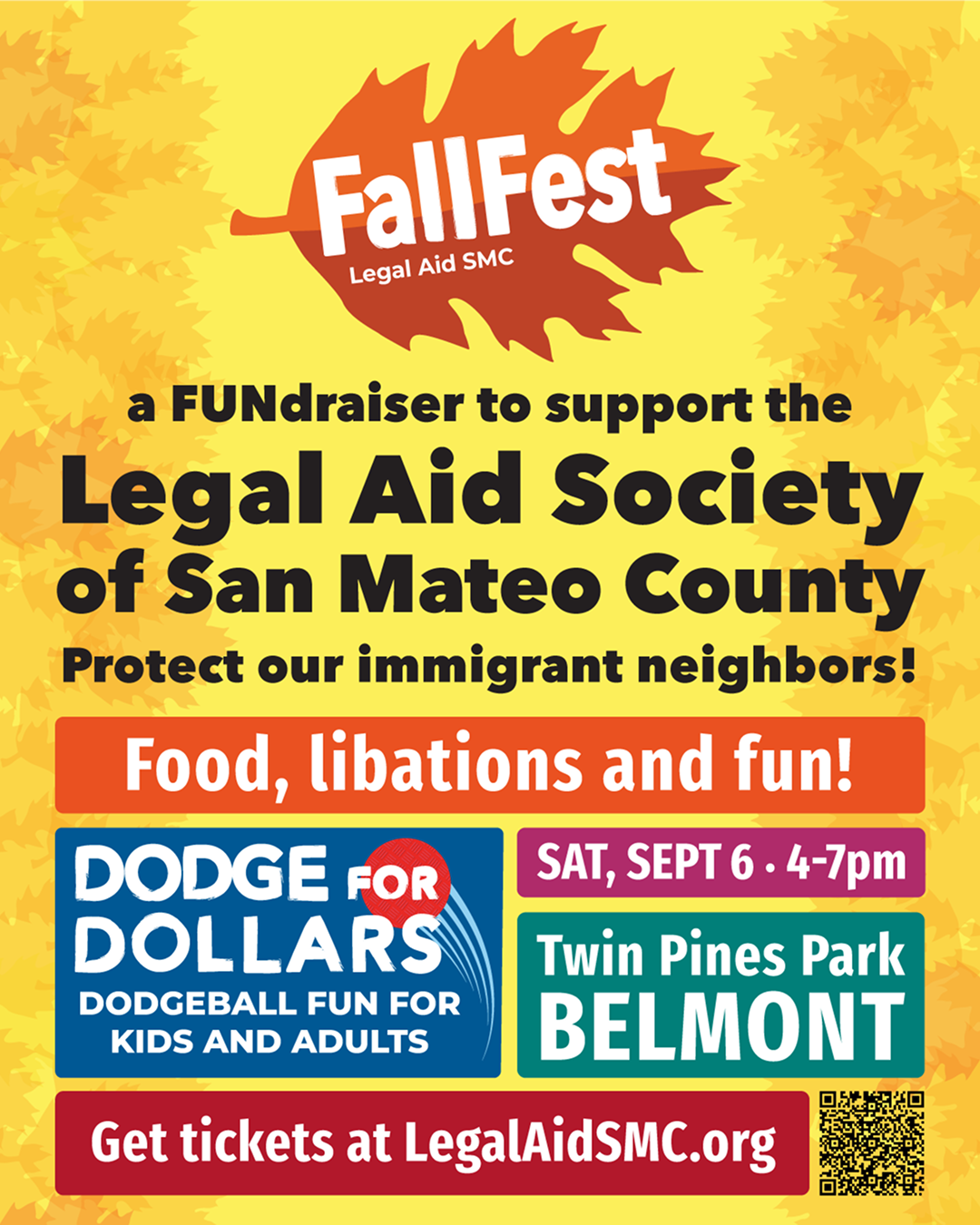 Please join us at Twin Pines Park in Belmont on Saturday, September 6th, from 4-7 p.m. for an evening in support of Legal Aid SMC! The event will include a family friendly dodgeball tournament, catered taco dinner, raffle prizes, and more!